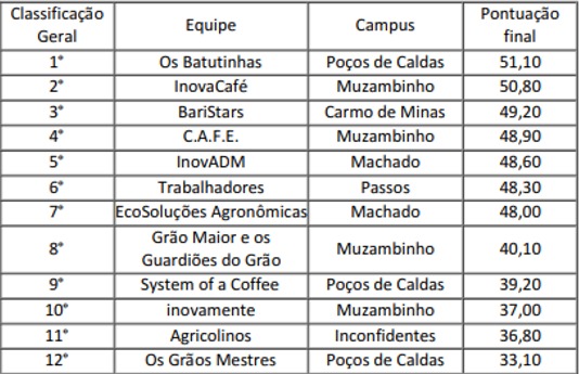 E ao final a equipe InovaCafé ficou em 2º lugar com apenas 0,3 pontos atrás de “Os Batutinhas”, 1º colocado que representou campus Poços de Caldas.